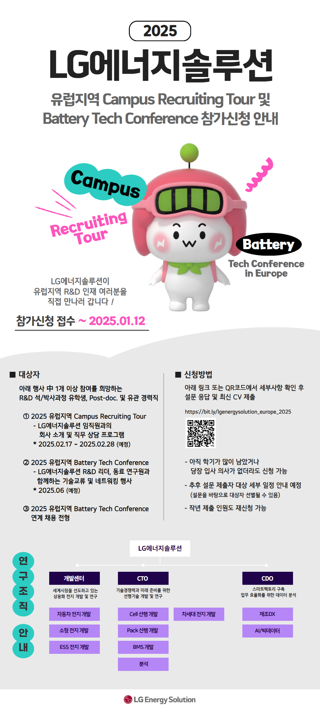 [LG에너지솔루션] 2025 유럽 R&D 석/박사 Campus Recruiting Tour 및 Battery Tech Conference 안내 Charge Your Tomorrow, Grow Together ! 글로벌 배터리 전문기업 LG에너지솔루션이 세계 시장을 무대로 함께 성장할 유럽지역 한인 R&D 석/박사 여러분을 찾아갑니다. 유럽의 주요 대학 및 지역에서 Campus Recruiting Tour을 진행할 예정이며, 2025년 6월 유럽에서 Battery Tech Conference를 진행할 예정이오니 많은 관심 부탁드립니다.